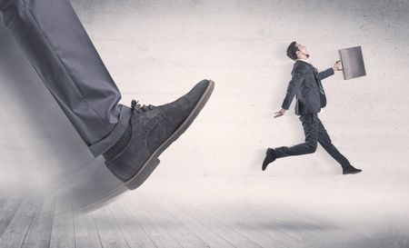 Big foot in a black shoe fire small, young, businessman who is flying away in the space