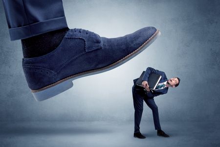 Big foot trying to crush small man who is afraid of that