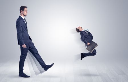 Big man in suit kicking out little himself with simple white wallpaper