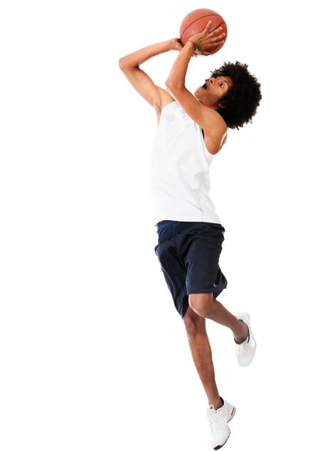 Black basketball player shooting the ball - isolated over a white background