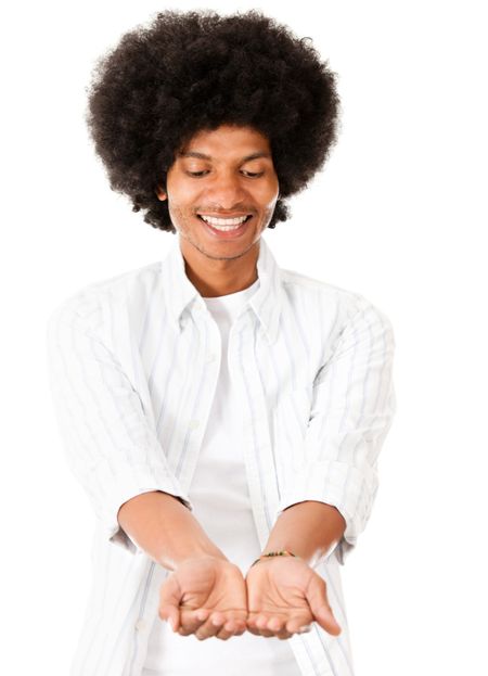 Black man holding something in his hands - isolated over white background