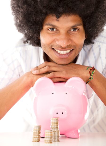 Black man with a piggybank - isolated over a white background