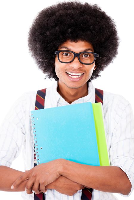 Black nerd student holding notebooks - isolated over a white background