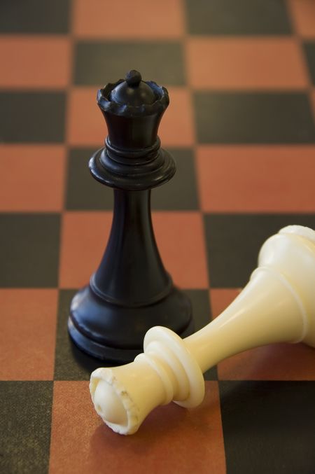 Black queen stands victorious over fallen white queen on chessboard
