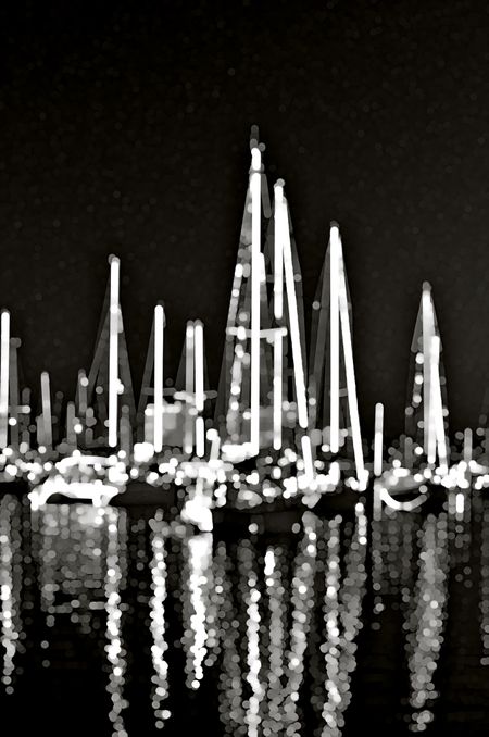 Black and white nocturnal abstract of sailboats with glowing masts and reflections together in a tropical marina (one of a series)