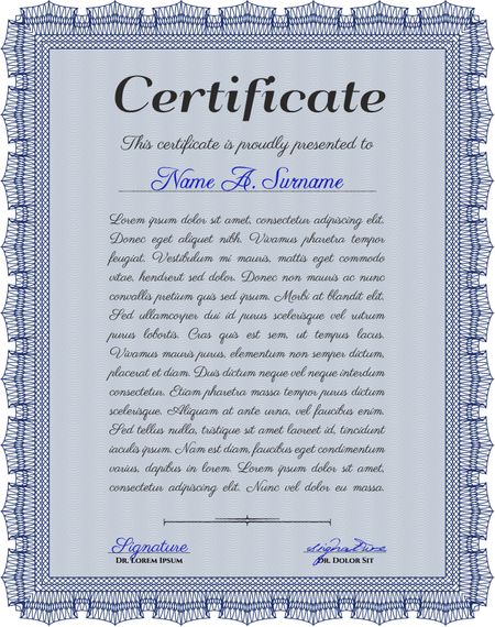Blue Diploma or certificate template. With complex background. Vector illustration. Lovely design.