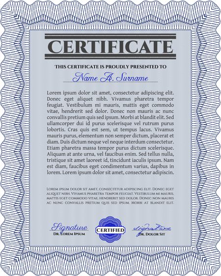 Blue Diploma template. With background. Border, frame. Excellent design.