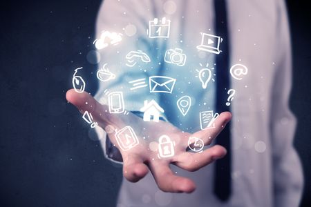 Blue multimedia icons in the hands of a businessman