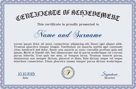 Blue Sample certificate or diploma. With complex linear background. Retro design.