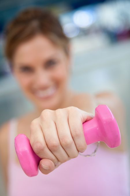 Blurry woman at the gym lifting a free-weight and smiling