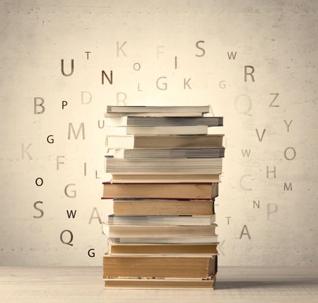 Books with flying letters on vintage old background