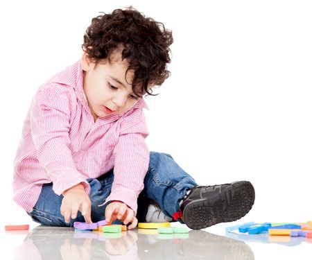 Boy playing with letters - isolated over a white background