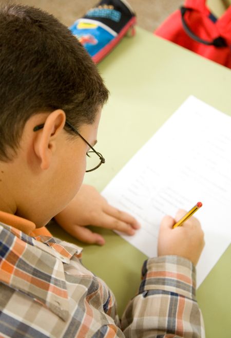 boy in primary school education answering a test - focus is on the glasses and eyelashes