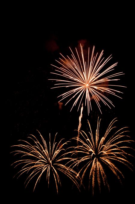 Bright burst of fireworks with rocket trail above feathery streaks of two others