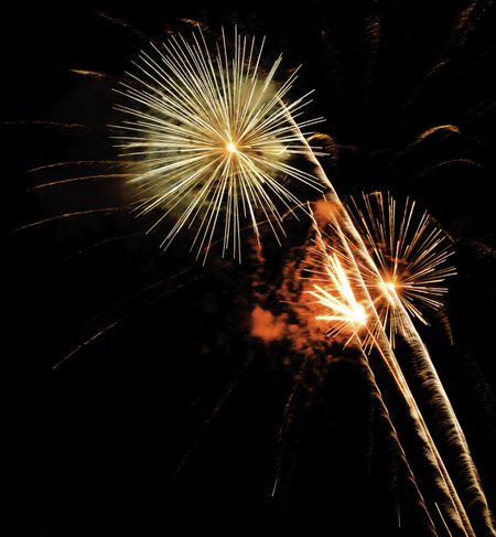 Bright bursts of fireworks with rocket trails and reddish and greenish puffs of smoke