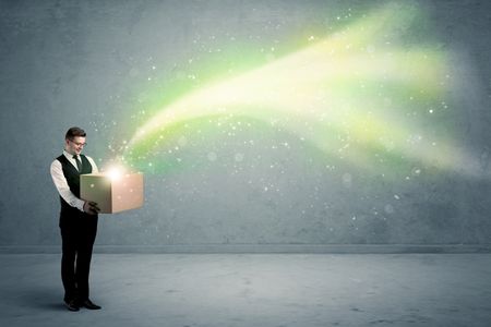 Bright yellow, green light beams escaping a cardboard box held by young elegant male business person in stylish suit concept.