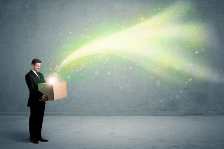 Bright yellow, green light beams escaping a cardboard box held by young elegant male business person in stylish suit concept.