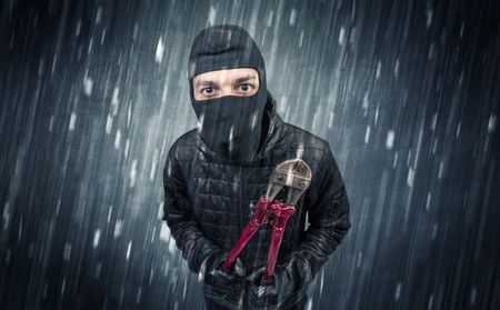 Burglar in action in black clothes with rainy concept.
