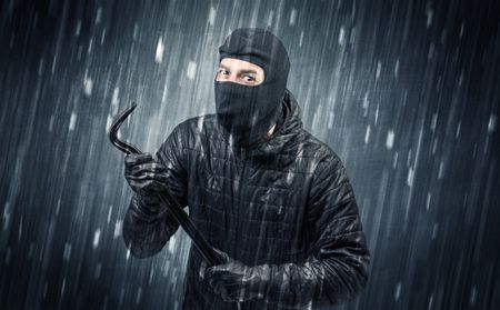 Burglar in action in black clothes with rainy concept.