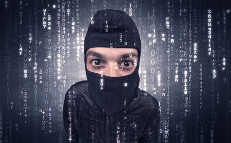 Burglar in action with encoded concept and his tools in his hand.