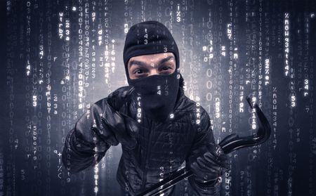 Burglar in action with encoded concept and his tools in his hand.