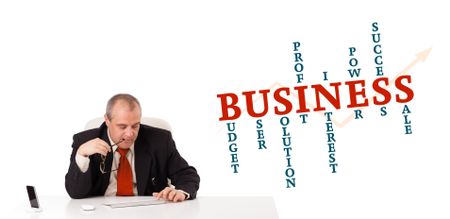 businesman sitting at desk with business word cloud, isolated on white