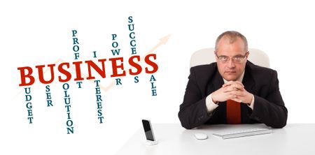businesman sitting at desk with business word cloud, isolated on white