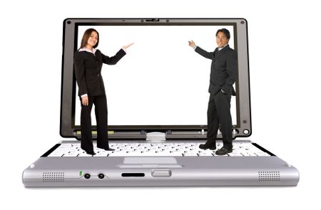 Business couple pointing at the screen of a laptop isolated