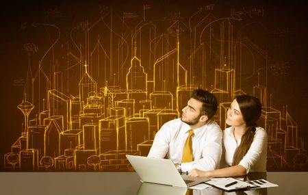 Business couple sitting at the black table with hand drawn buildings and numbers on the background