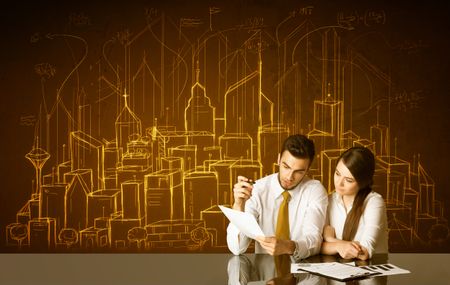 Business couple sitting at the black table with hand drawn buildings and numbers on the background