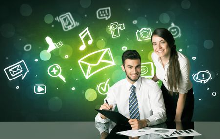 Business couple sitting at the black table with social media symbols on the background