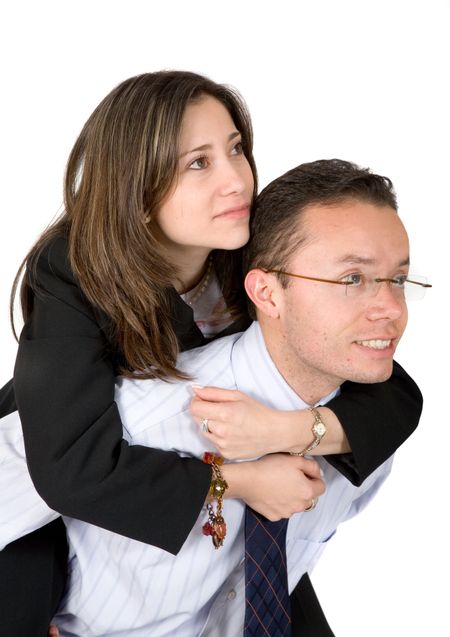 business couples looking away one is carrying the other