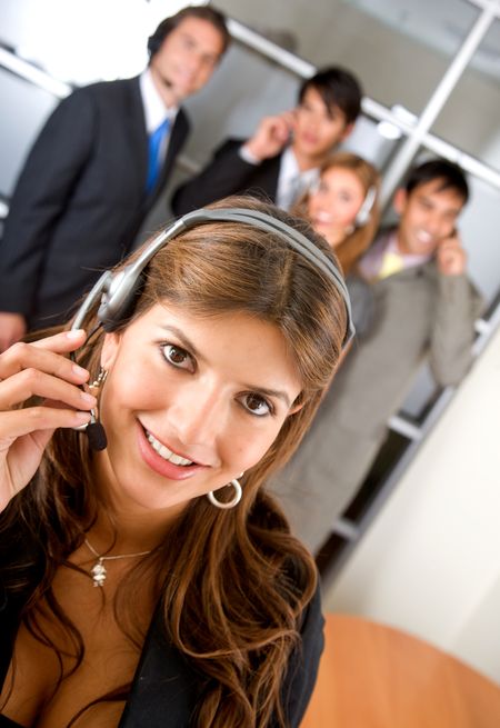 business customer service woman smiling with her team behind
