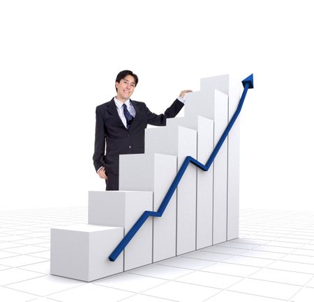 business entrepreneur with a graphics chart over a white background with a tiled floor
