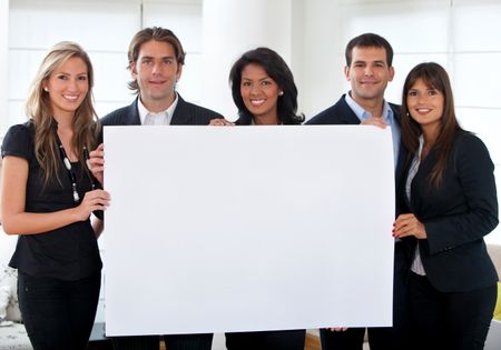 Business group holding a banner at an office