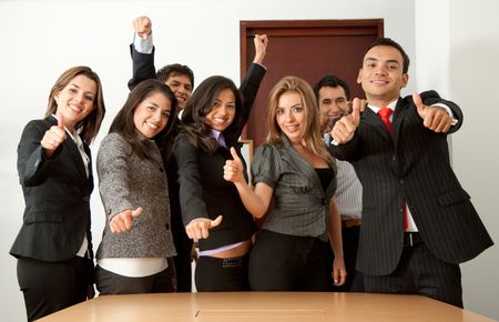 Business group in an office with their thumbs up