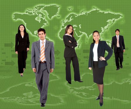 Business group standing over a world map