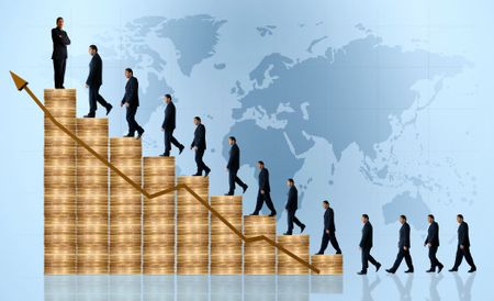 business growth and success graph with a businessman walking up the graph and a worldmap in the background