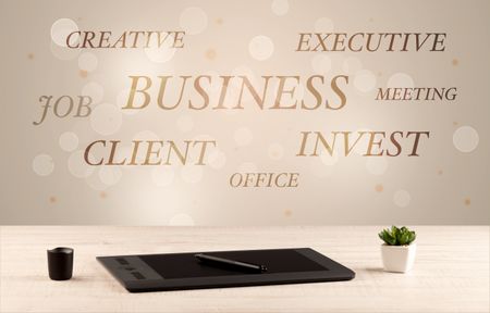 Business job office concept with close up wooden desk and materials, papers and electronic equipement