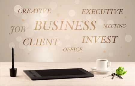 Business job office concept with close up wooden desk and materials, papers and electronic equipement