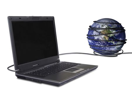 business laptop connected to the globe, online communications