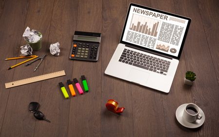 Business laptop with stock market report on wooden desk and accessories