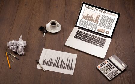 Business laptop with stock market report on wooden desk and accessories
