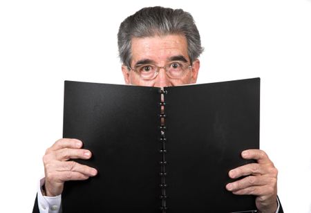 business man with a book over a white background