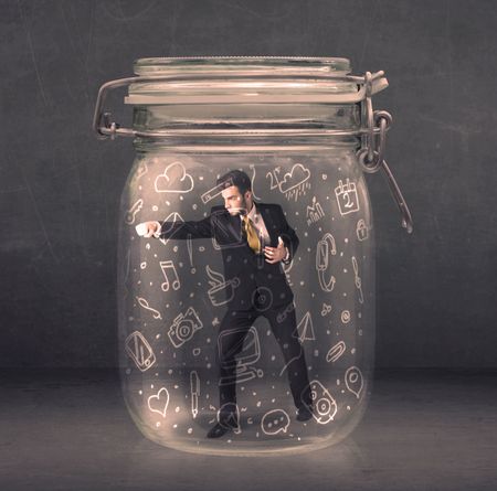 Business man captured in glass jar with hand drawn media icons concept on background