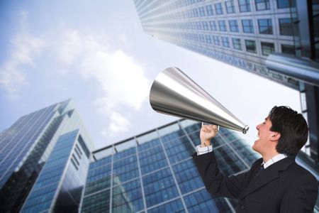 Business man outside corporate building with a megaphone