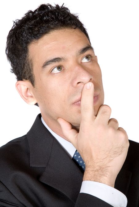 business man deep in thought over a white background