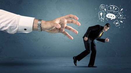 Business man with doodle icons running from a big hand concept on background