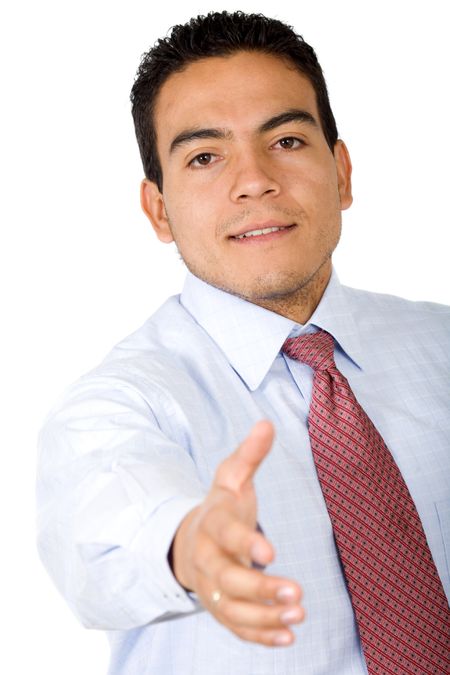 business man extending his hand to offer a deal - isolated over a white background