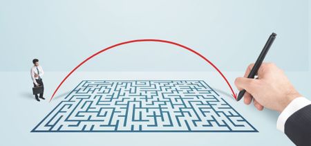 Business man in front of hand drawn maze thinking how to get through
